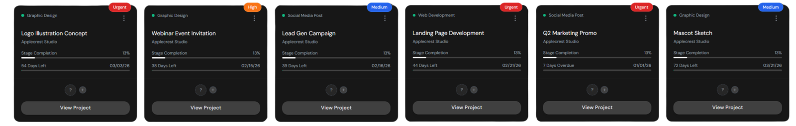 Your command center for every engagement. View work in card or list mode, sort and filter quickly, and keep delivery moving without losing context.