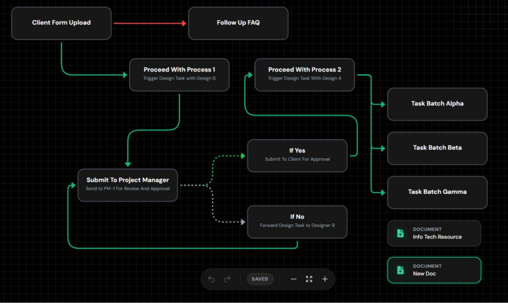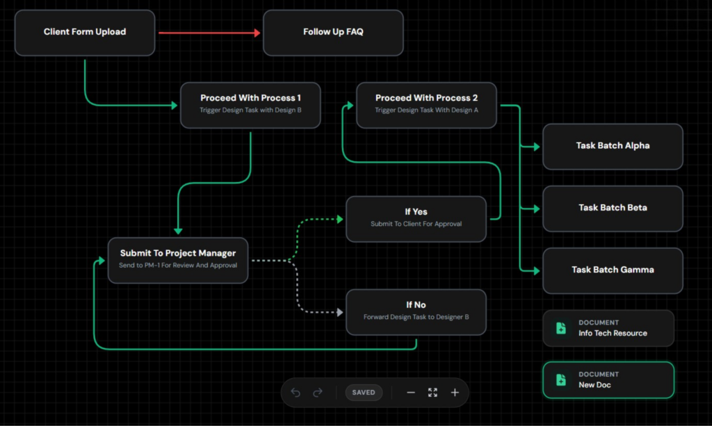 Docflows is where planning becomes execution. Build visual workflows on a canvas using nodes and connections, add notes, then save and reopen processes any time—perfect for SOPs, client journeys, or delivery checklists.
