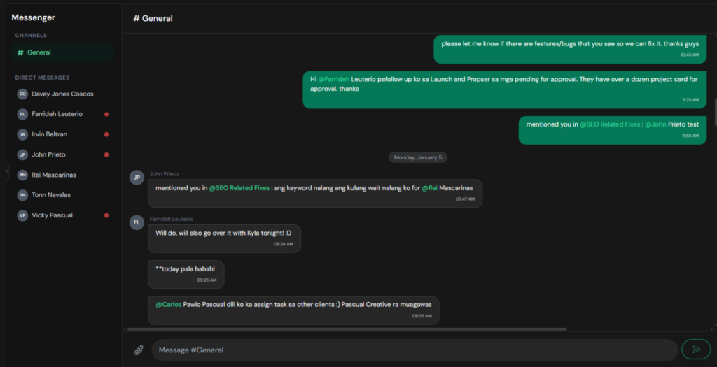 Messenger keeps communication inside ClearSuite so conversations stay connected to your operations. Use channels or direct messages, share attachments, and keep important messages easy to reference.