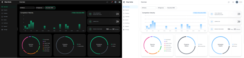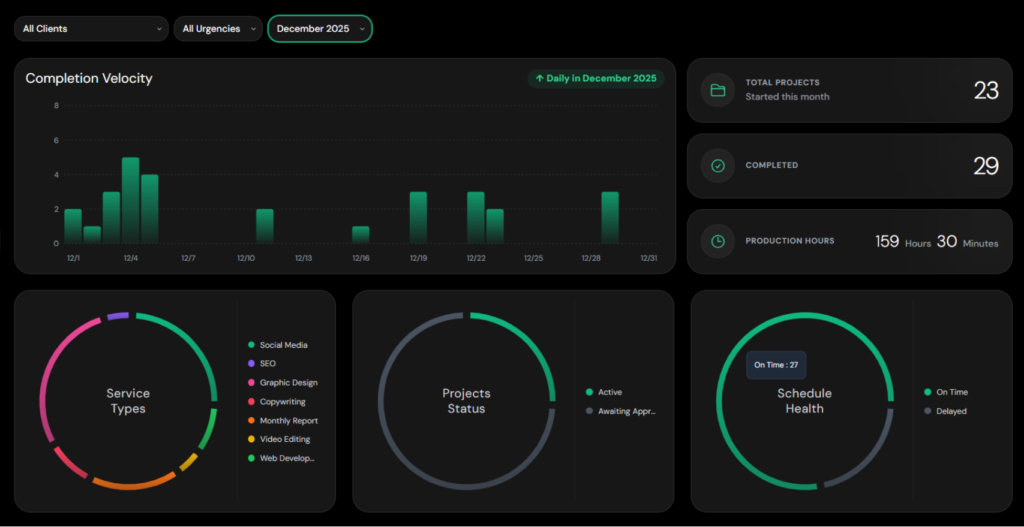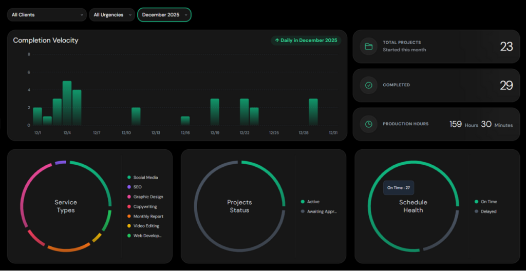 The ClearView Dashboard turns your work into clear, visual insights—so you can spot what’s on track, what needs attention, and hours spent on each task.