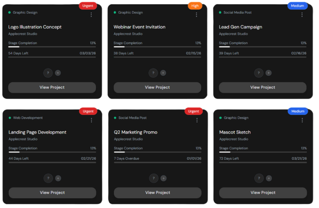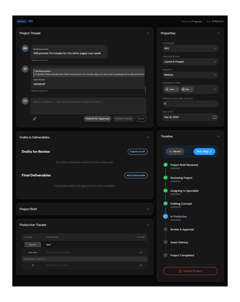 Each project has its own workspace where the brief, conversation, deliverables, and timeline live together. Requests move through drafts, feedback, approvals, and final delivery without email chains.